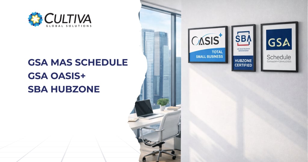 Over the years, CULTIVA has earned some meaningful credentials: a GSA MAS Schedule, participation as a partner on GSA OASIS+, and SBA HUBZone certification.